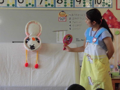 歯科衛生士さんに人形劇や大きな“歯”を使って正しい歯ブラシの持ち方や、磨き方、うがいの仕方などを教えてもらいました。シュッシュッシュ~と歌いながら楽しく覚えることができました。