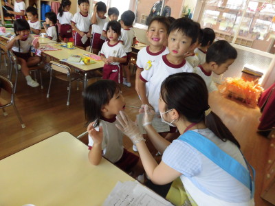 また一人ひとり染めだしを行い、真っ赤になった歯に驚きながらも手鏡を持って真剣に磨くことができました。ピカピカになった歯をうれしそうにお友だちと見せ合っていました。