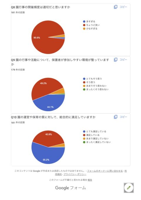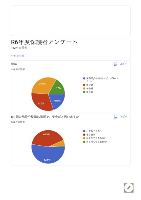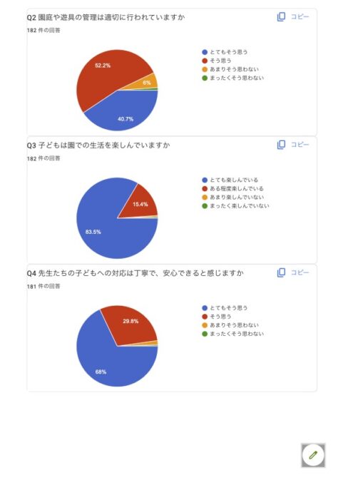 当認定こども園では、「就学前の子どもに関する教育、保育等の総合的な提供の推進に関する法律」及び同施行規則に基づき、園の教育・保育の質の向上と運営の透明性確保のため、保護者の皆様を対象とした保護者評価(アンケート)を実施しております。評価結果を踏まえ、今後の教育・保育内容および園運営の改善に活かすとともに、結果を以下のとおり公表いたします。