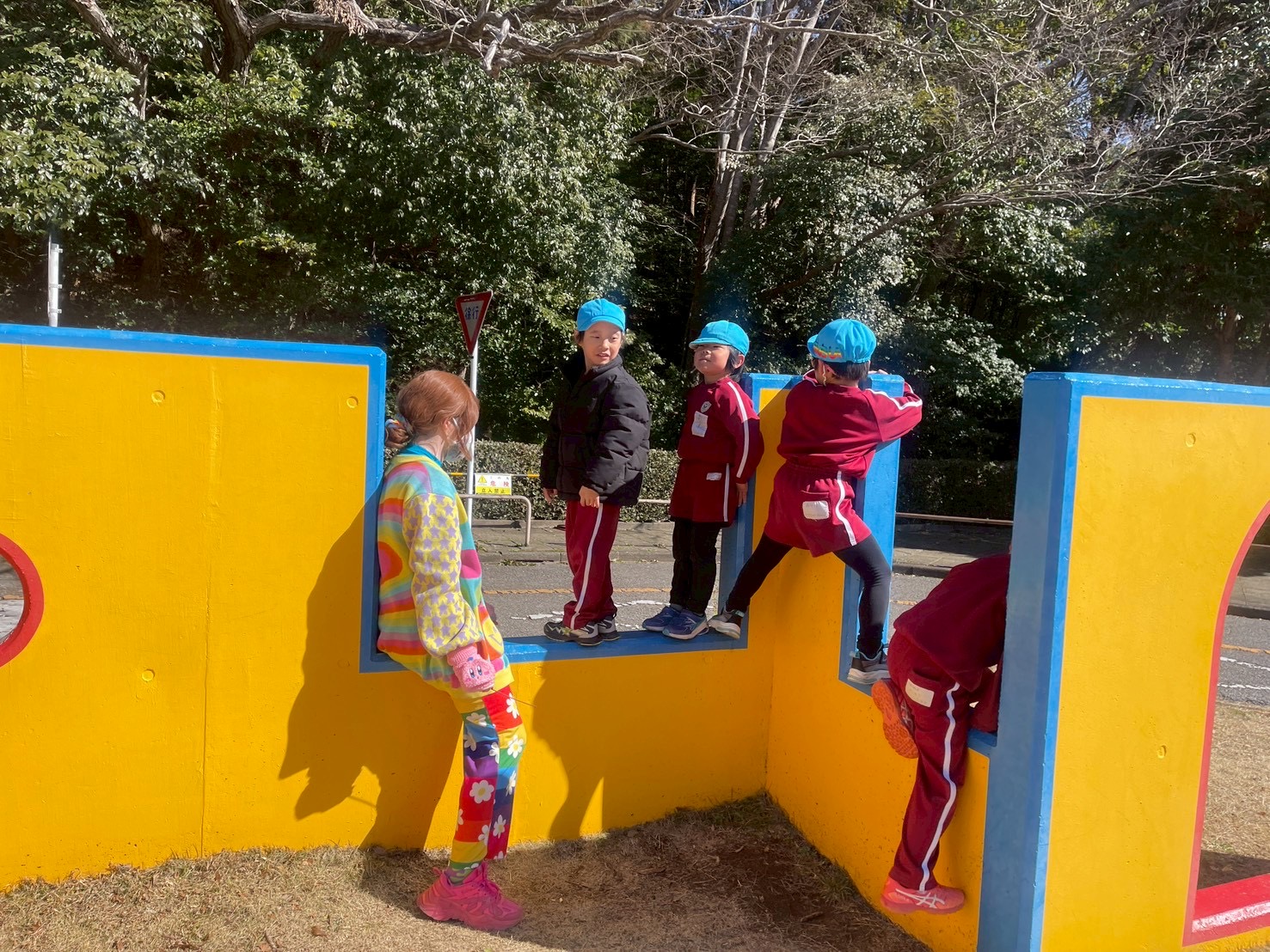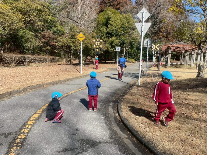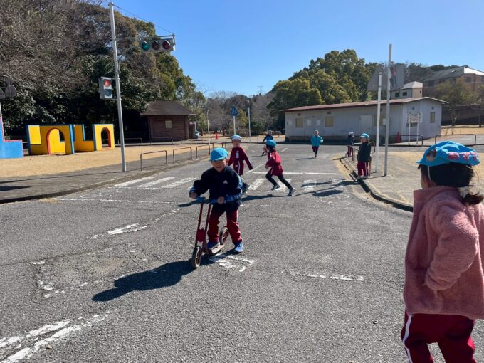 公園に到着すると、本物のような信号・道路に大興奮しながらスクーターや縄跳び、大きな滑り台に大興奮しながらたくさん遊びました。「本当に信号ついてる!!」「滑り台大きすぎる!!」と友だちと大盛り上がりで、時間いっぱい遊び大満足なようでした。