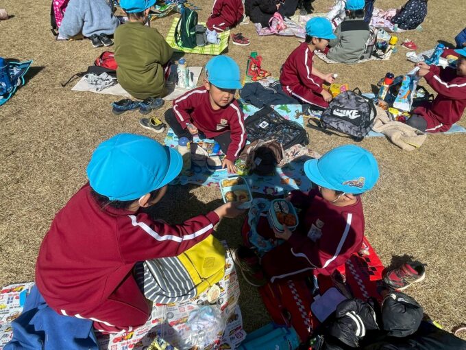 昼食はみんなが楽しみにしていたお弁当!「卵焼きあるよ!」「サンドウィッチにしたんだよ」など話ながらピカピカに食べる子どもたちでした。外で食べるお弁当は格別に美味しかったようでした。