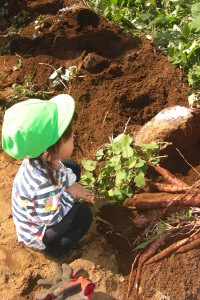 畑までの長いお散歩も楽しみ、いざ畑へ!!どんな形のお芋が出てくるか、ワクワクしながらおうちの人と掘っていました。お友だちも練習の成果を十分に発揮し、掘り出した大きなお芋や、細くて長いお芋を見て大喜びでした。
