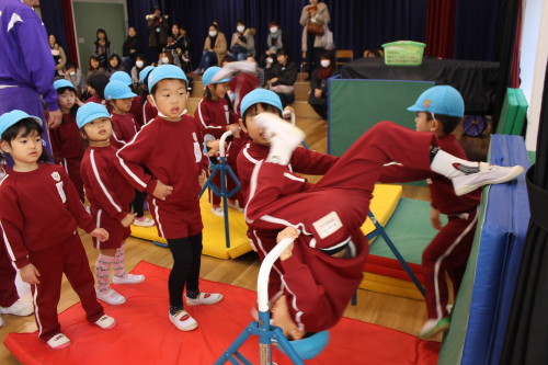 年中組さんは『体操』では「マットでの後転と鉄棒での逆上がり」、『お話』は「反対ことばのかるたあそび」、『制作』は「サンタクロースの帽子作り」、音楽は「リトミックあそび」を行いました。