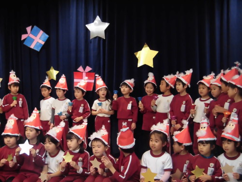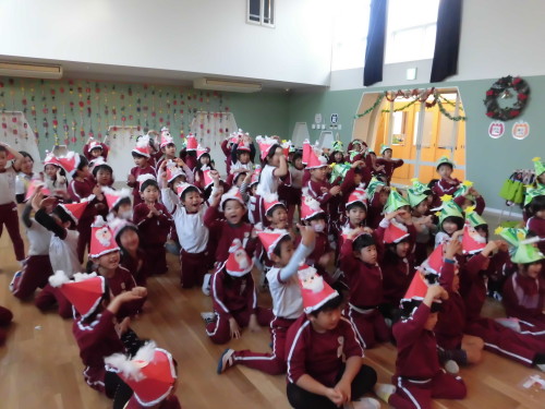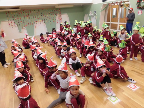 子どもたちはみんな、『制作』の時間に作ったクリスマスツリーとサンタクロースの帽子を被って参加しました。