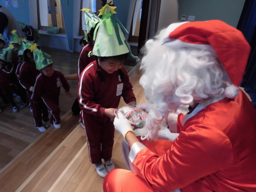 最後の最後は子どもたちが楽しみにしていたサンタクロースの登場です!突然聞こえてきた鈴の音に、お遊戯室内が一斉に静まり返り、ステージ上にサンタクロースが登場すると、子どもたちは立ち上がり大興奮でした。一人ひとりサンタさんからプレゼントをもらい、みんなとても喜んでいました。最後まで充実したクリスマス会となりました。