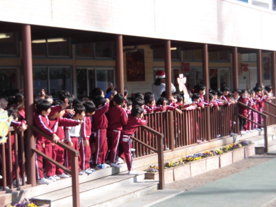 園門からサンタさんが登場すると大喜びの子どもたち。大歓声とともにサンタさんを迎えました。