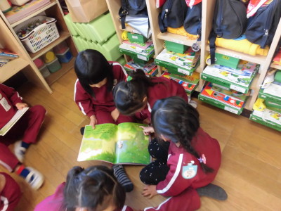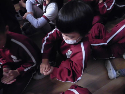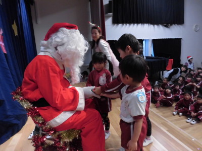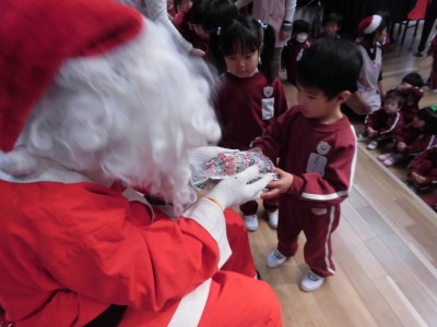 最後は待ちに待ったサンタさんの登場です。質問をしたり、一人ひとりプレゼントをもらったりしました。憧れのサンタさんに少し緊張してしまう子もいましたが、きちんとお礼を言うことができました。