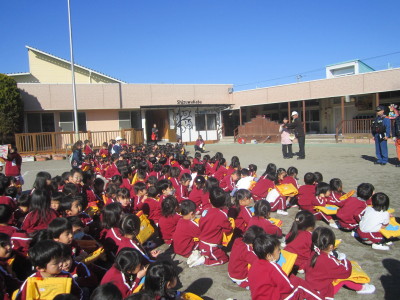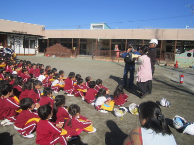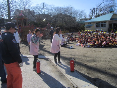 消火訓練では、消火器を持って火を消す先生たちの姿を見て、応援したり、拍手をしたりして見学をしました。