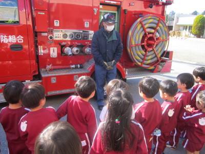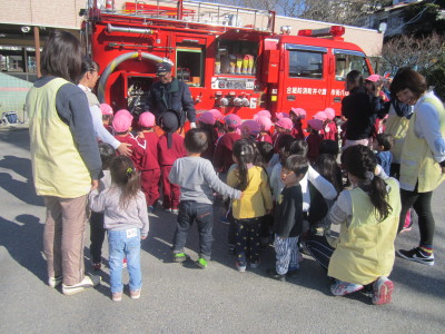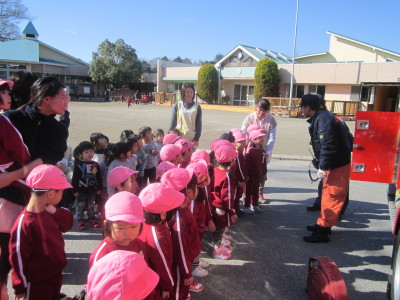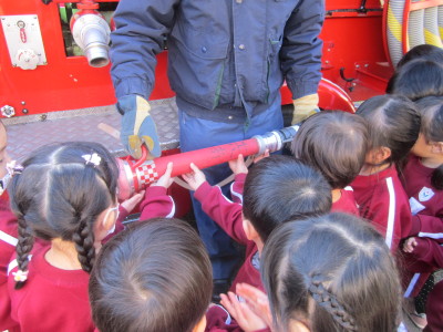 大きな消防車を目の前に大興奮の子どもたち、消防署の方に質問をしたり、ホースを触らせてもらったりして大満足の様子でした。