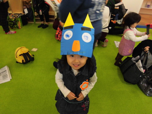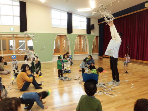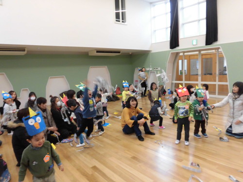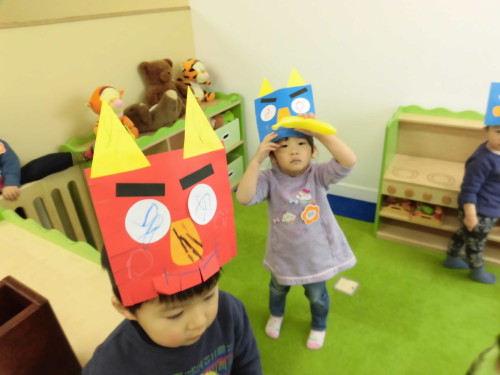 最後はできたお面をつけて、新聞紙を小さく丸めて豆に見立てて、みんなで豆まきごっこをしました。