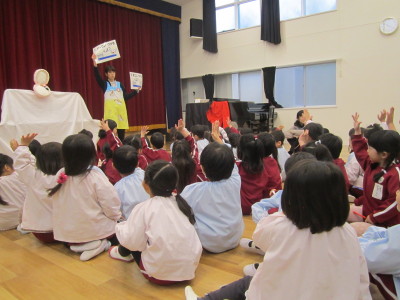 始めは、お遊戯室で人形劇や、大きな“歯”を使って正しい歯ブラシの持ち方や磨き方、