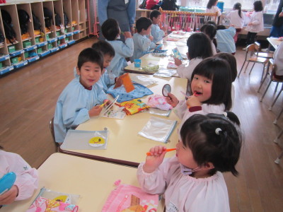 ピカピカになった歯をうれしそうにお友だちや先生に見せていました。