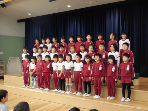 英語あそびのあとは、年長組のふじ組さんが歌の発表にきてくれました。元気いっぱいの歌声に、エンジェルのお友だちも圧倒されていました。