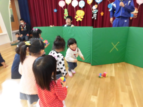 ボールあそびでは、お家の人とキャッチボールを行いました。体操の先生から上手にボールを投げる方法のお話があり、お家の人と練習した後に、マット怪獣に向かって、みんなでボール投げもしました。