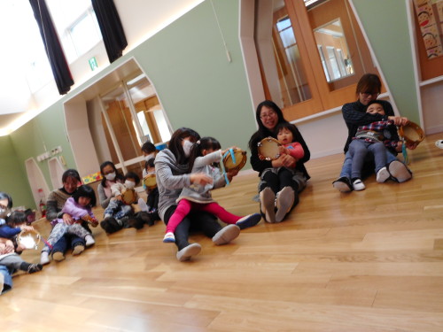 今回は子どもたちと先生だけで、幼稚園バスに乗ってユーカリが丘までお散歩に行く活動でした。バスに乗る前に、タンバリンを使ってリトミックを行いました。タンバリンを車のハンドルに見立てて、お母さんの膝の上ででこぼこ道や、くねくね道を運転したり、お遊戯室の中を運転しながら、クラクションように叩いて鳴らしたりして遊びました。