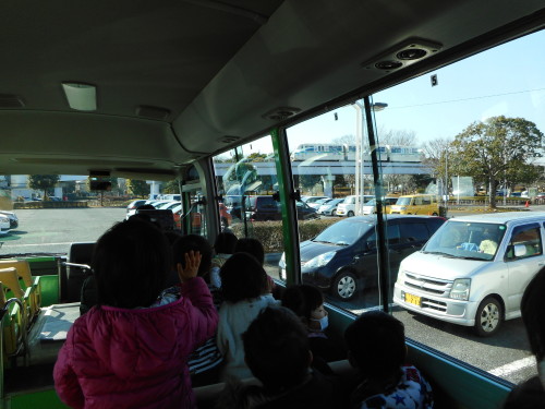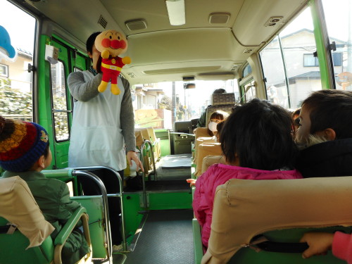 お母さんと離れて一人で乗ることに不安になってしまうお友だちもいましたが、バスが出発していろんな景色が見えてくると、『イオンだ!』『こっちにぼくのおうちがあるよ』など、自然と子どもたちのおしゃべりも盛り上がってきました。