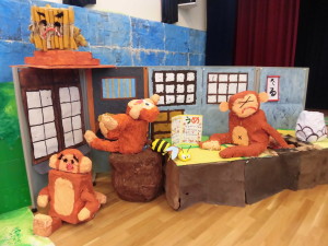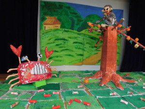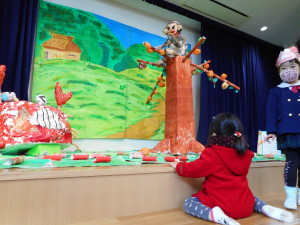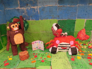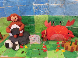 年長さんは、「カニの逆襲の場面」「さるがカニに謝る場面」を作りました。場面に合わせて、さるの表情を変えたり、みんなでアイディアを出し合ったりしながら、工夫して丁寧に作りました。