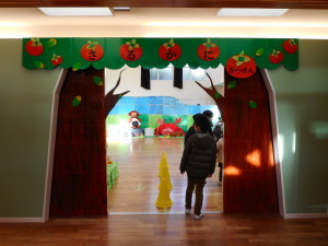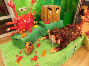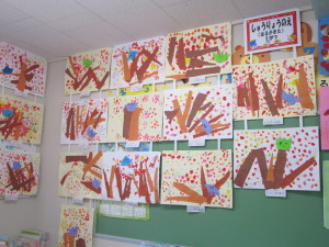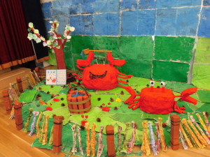 各クラスで作ったものがお遊戯室に集まり、素敵なさるかに合戦の物語に変身しました。