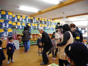 自分たちで作ったさるかに合戦のお面をつけておうちの人と一緒にお遊戯室をまわりました。「すごい!!」と驚いたり、「楽しかった」と喜んだり、みんなで力を合わせて作り上げた作品を、おうちの人に見てもらうことができ、とても満足そうでした。