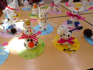 おひさまくらぶさん(2歳児)は、小さいカニとおにぎりを作りました。みんなで協力しておにぎりを作ったり、紙粘土にストローをつけたり絵の具で色を塗ったりし、かわいらしく作りました。