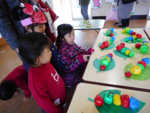 年中さんは、「柿の芽が出て木になる場面」「さるがカニに柿を投げつける場面」を作りました。グループごとにカニやさるの形を作ったり、柿の実を丸めて作ったりのびのび作りました。