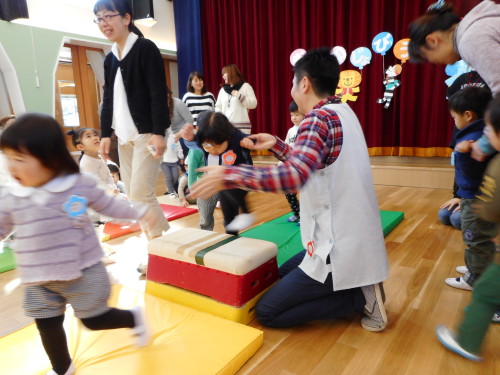今日の主活動は体操の先生と一緒に、マット・跳び箱を使っての器具運動でした。まずは音楽にあわせてリズム体操で準備運動を行いました。器具運動はこれまでも何度か行っているため、子どもたちはお家の人の傍を離れて、一人でどんどんチャレンジしていました。