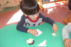 2月は、ひな祭りに向けて、おひなさまを作りました。おひなさまの着物を千代紙で三角に折りました。仕上げは、紙皿にお絵描きをして貼りました。ユラユラ揺れるおひなさまができると、子どもたちも大喜びでした。
