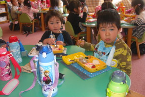 初めての給食に戸惑っている子もいましたが、お友だちと一緒に食べることができ、うれしそうでした。年少さんになってからの楽しみがまた1つ増えたようです。