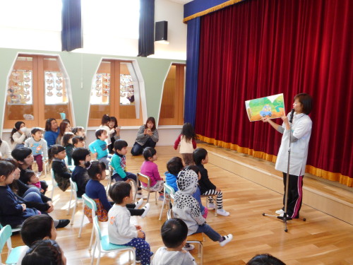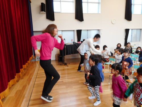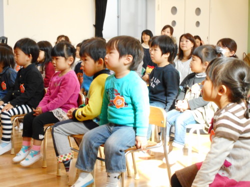 まずは年長組のさくら組さんが『あしたははれる』の歌を披露してくれました。元気いっぱいの歌声に、みんな真剣に聞き入っていました。歌い終わった後は、子どもたちだけではなく保護者の方からも大きな歓声が上がり、さくら組さんの子どもたちも照れくさそうな表情でした。