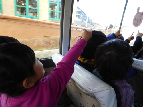 バスの中では周りの景色を眺めたり、シルエットクイズなどをしたり、終始元気いっぱいの子どもたち。興奮して思わず立ち上がってしまう場面も見られました。バスの中の子どもたちは、普段お家の人と一緒にいる姿とはまた違って、普段は照れくさくてお家の人後ろに隠れてしまうお友だちも、窓から見える景色に『あっ、あそこいったことある!』『みてみて!!』と大きな声を出したり、クイズでも正解すると『やったぁ!!』を喜びを体いっぱい表現してくれたりと、たくさんの姿を見せてくれました。