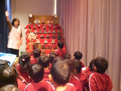 お部屋ではひなまつりについての絵本や紙芝居を見たり、由来についてのお話を聞いたりしました。