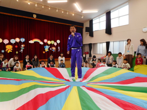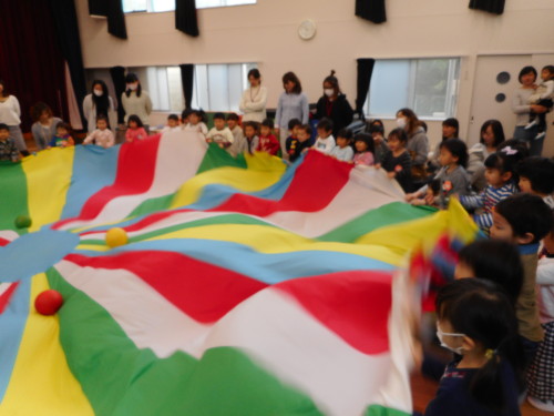 まずは 、体操の先生と一緒に『パラバルーン』を行いました。大きなバルーンに子どもたちは興味津々でした。
