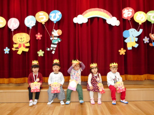 また、3月生まれのお誕生会も行いました。お誕生日のお友だちは4月からずっと楽しみにしていたので、お名前が呼ばれると笑顔で前に出て、冠とお誕生カードをもらいました。エンジェルのお友だちもみんな3歳を迎えることができました。まだまだ小さいエンジェルさんですが、2歳から3歳へと成長するこの一年間、みんな本当に逞しくなりました。