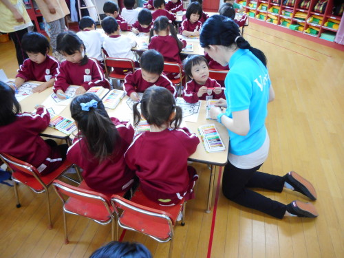 最初に先生からクレヨンの使い方や、クレヨンにはどんな色があるかな?などのお話を聞きました。