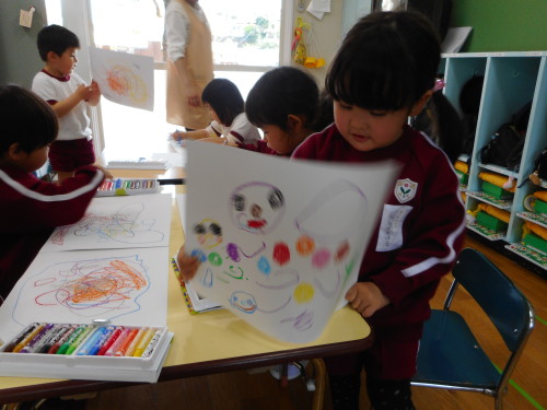 どちらも描き終えると『せんせい、こっちきて!』『みてみて、できたよ♪』とうれしそうに先生に見せていました。