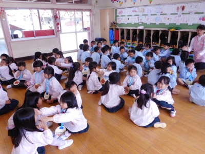 年長さんが兄弟クラスの年少さん、年中さんのお部屋に行き、歓迎会を行いました。