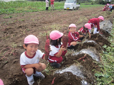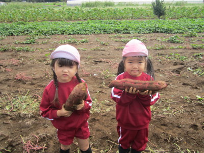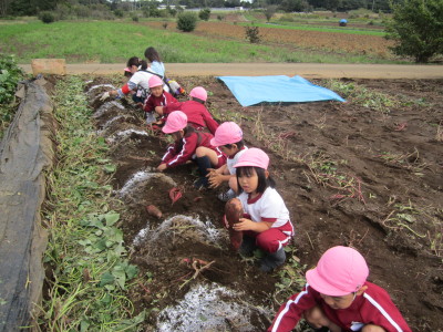 畑に着くと土の中に隠れているお芋を、小さな手で一生懸命かいて掘りました。お芋が見えてくると「わぁ!でてきた!」と大喜び、掘るスピードも一段と上がります。「よいしょ!」とお芋を力いっぱい引っ張って、見事大きなお芋を掘り当てると「先生、みてみて!」と大興奮でした。