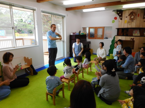 活動は英語の先生との『英語あそび』や、お家の方にお子様の名前と好きな遊びを発表してもらう自己紹介を行いました。