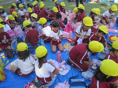 草笛の丘に戻り、おいしいお弁当を食べ、お友だちや先生とおやつ交換を楽しんでいました。