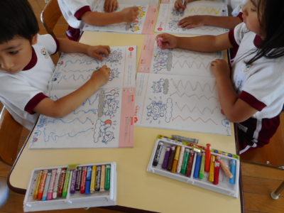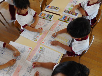 『せんのワーク』ではジグザグの線をゆっくりなぞりました。点線からはみ出さないように、子どもたちは真剣な表情で取り組んでいました。