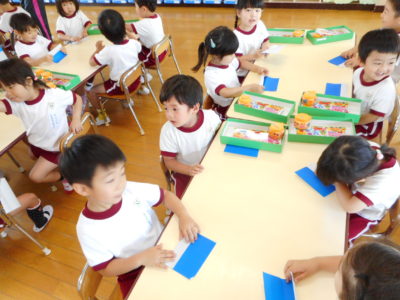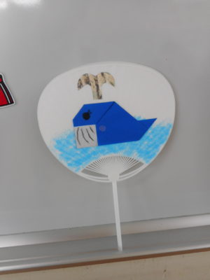 『うちわ制作』は折り紙でクジラを折って作ります。折り方で少し難しい部分もあり、先生の説明を聞いて。『できるかなぁ・・・』と心配そうな声も聞かれましたが、わからない部分は先生に聞きながら、みんな上手に折ることができました。完成したクジラを手に、『せんせいできたよ♪』と見せにきてくれる子どもたちの表情からは、達成感が溢れていました。