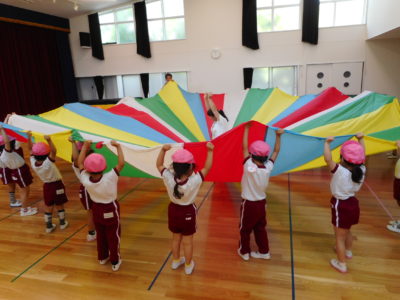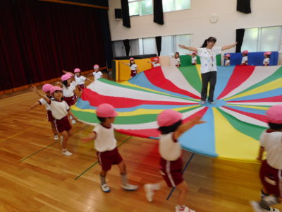 5月に入ってからの体操では9月の運動会に向けて、早速パラバルーンの練習を行っています。体操の先生から『あさがお』『こま』などいろいろな技を教わっています。新しい技を聞くたび、子どもたちの目は輝いていて、『はやくやりたい!』という気持ちが伝わってきます。運動会ではどんな演技を披露してくれるのか今から楽しみです。