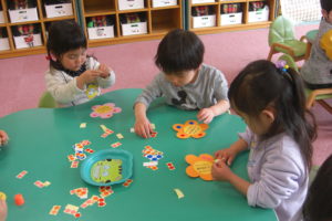 たくさん遊んだあとは、みんなでお片付けです。散らばった新聞紙を『せんせい、まだいっぱいあった!』と隅々まできれいにお片付けすることができました。中には『ゴミしゅうしゅうしゃで~す♪』とかわいいアナウンスも聞こえてきました。
