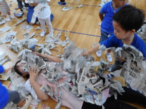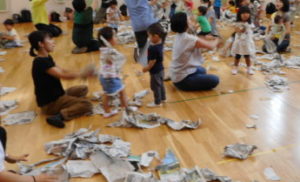 また、今日は新聞紙を使って遊びました。新聞紙をバットとボールに見立てて遊んだり、新聞紙をビリビリに破いて、新聞紙の花火にしたりと、普段なかなかお家ではできない、ダイナミックな遊びを行うことができました。