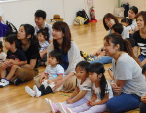 今日の活動は『体操』でした。まずは親子で『せんたく』というふれあい遊びを行い、その後は子どもたちが大好きな『わぁお!』を踊りました。