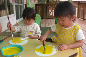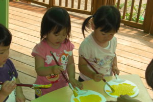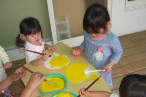 うちわ作りは、絵の具を使いました。初めて絵の具を使うお友だちが多く、筆を持った時の表情はイキイキとしていました。