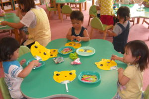 のびのびと色をぬったり、のりを使った事で子どもたちも作る楽しさを味わえたようです。 今後の制作も子どもたちと楽しんで取り組んでいきたいと思います。