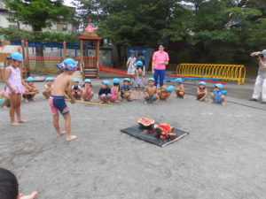 すいかが運ばれてくると、「大きい~!」「絶対割るぞ!」と子どもたちも気合いが入ります。