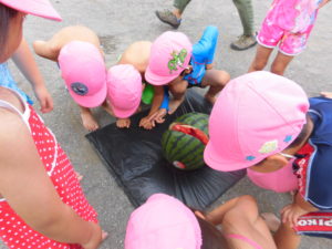 最後はぱっくりとすいかが割れ、「やったー!」「おいしそう」とみんなで喜びました。