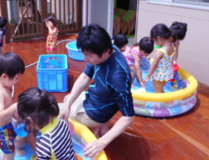 今回はお部屋のテラスで水遊びをしました。子どもたちもとても楽しみにしていたようで、いつも以上に張り切って登園していました。